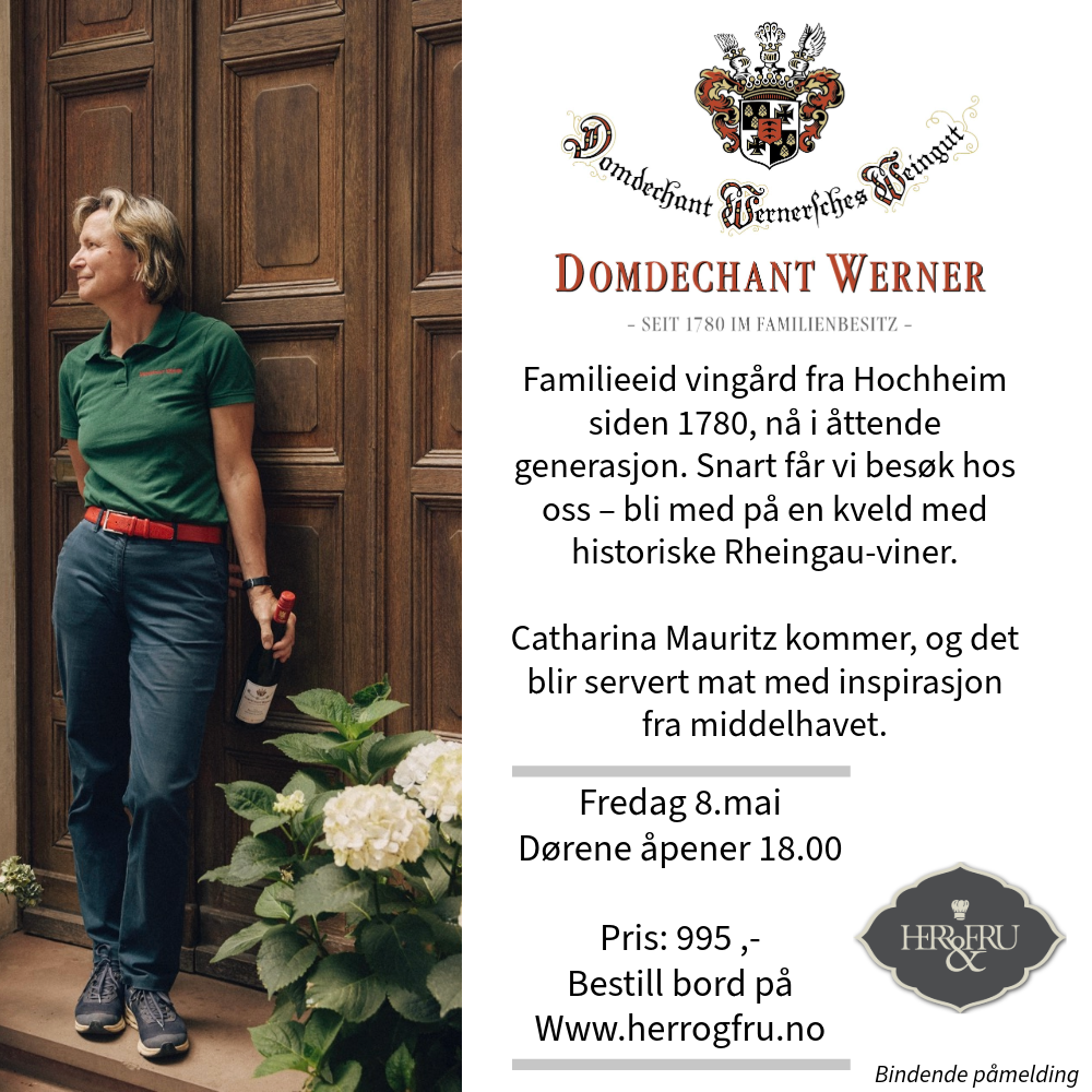 Catharina Mauritz kommer for å presentere deres viner fra den familieeide gården i Hochheim. Det blir servert en meny men inspirasjon fra middelhavet til vinen.